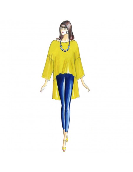 Casacca over corta davanti e lunga dietro con collo a barchetta, maniche a giro basso e orlo in drittofilo. Tessuti consigliati: jersey, seta a disegno foulard, organzino, cotone o chiffon.