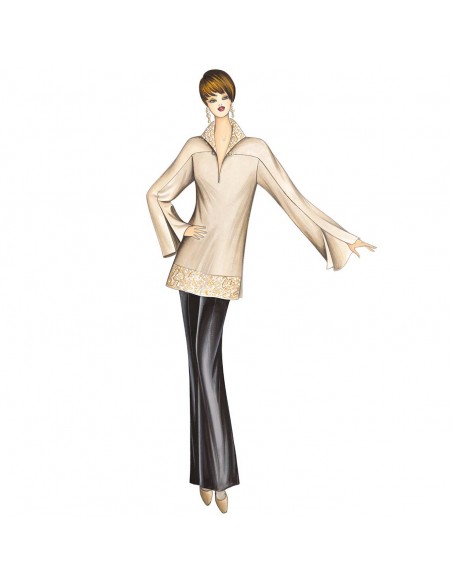 Raffinata casacca di linea semi-diritta con collo a polo e bordo al fondo ricamati in paillettes o perline, spacchi laterali e maniche a martello svasate che si possono realizzare con spacchi ai polsi o con arricciatura a coulisse. Tessuti consigliati: organza, jersey pesante, crêpe satin, cady. Pantaloni n. 8670.
