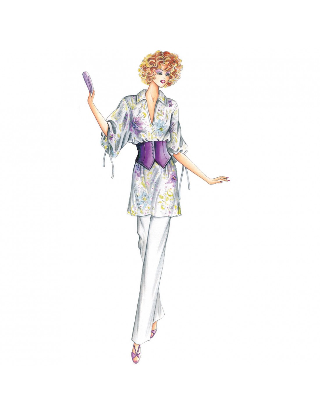 Camicia stile Japon con ampie maniche a kimono, alta cintura a forma di gilet fermato da fitti bottoncini. Tessuto consigliabile mussola fantasia per la camicia e stretch o raso per la cintura.