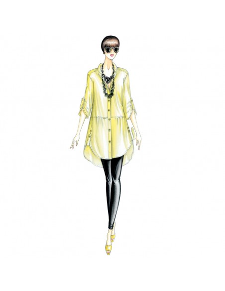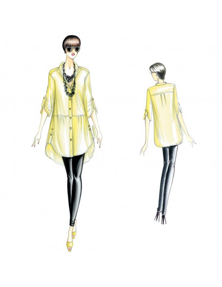 Maxi camicia sportiva di linea svasata con collo alla coreana, fondo stondato più lungo sul dietro siglato ai lati da listelli che si ripetono sulle maniche ¾ a trattenere drappeggio ai polsi. Realizzabile in batista o mussolina di cotone. Gilet n. 2208.