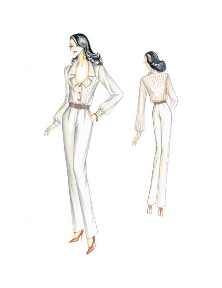 Un originale collo ad effetto origami incornicia la scollatura scostata nella raffinata camicia blusante con maniche arricciate ai polsi, realizzabile in batista, crêpe de chine, organza.