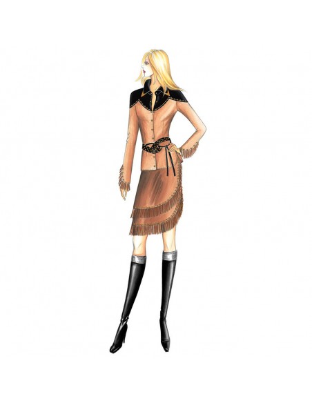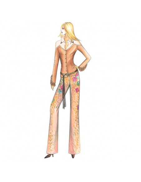 Camicia stile country in tessuto di fustagno bicolore, sprone con applicazione di borchie e maniche con polso stondato guarnite di frangia. Gonna n. 9285. Pantaloni n. 5381.