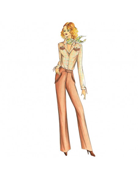 Camicia sportiva da realizzare in flanella scozzese con sprone in sbieco e frangia inserita, polsi con anelle fermate da laccetto. Pantaloni n. 9291.