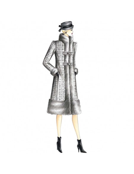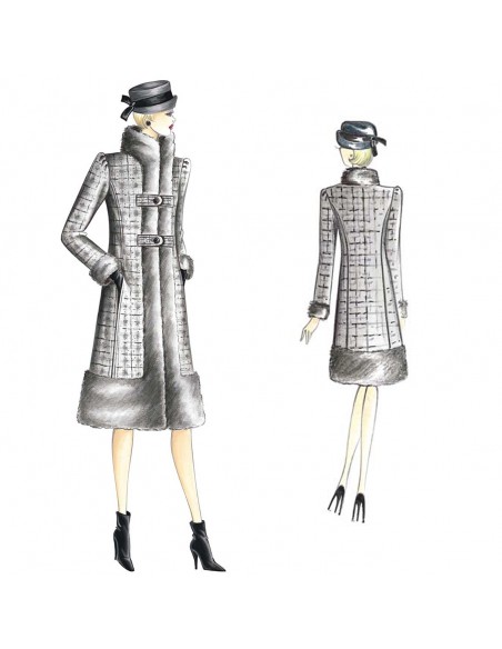 Cappotto stile “Zarina” da realizzare in lana scozzese con guarnizioni in pelliccia di castoro, allacciatura accostata fermata da listelli e maniche con spalle arricciate.