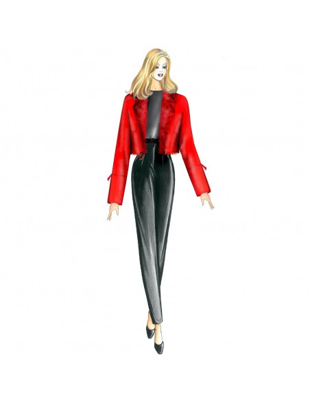 Moderne impunture barré percorrono il lungo cappotto monopetto chiuso da alamaro con tagli perpendicolari, collo sportivo e maniche a giro rientrante quadrato con zip ai polsi. Realizzabile in suede con interno astrakan, eco-montone, pelle, lana cotta o mohair double-face. Si può fare anche in versione corta e a bolero.