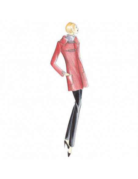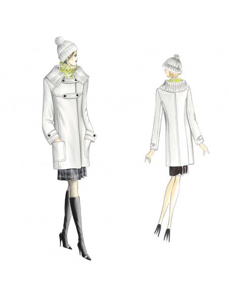Montgomery di linea semi-diritta con allacciatura a doppio incrocio chiusa da listelli stondati, ampio collo scostato realizzabile sia in maglia a coste che in tessuto (cartamodello in due versioni incluse. Realizzabile in panno o loden.
