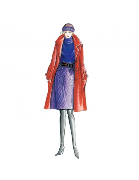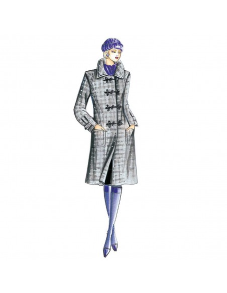 Cappotto monopetto di linea semi-modellata con ampio collo sportivo, spalline esterne sottolineate da impuntura, maniche mosse da pieghe ai polsi fermate da listelli, tasche a toppa.