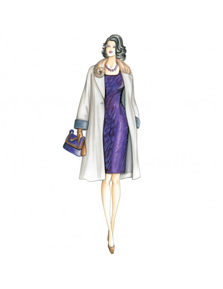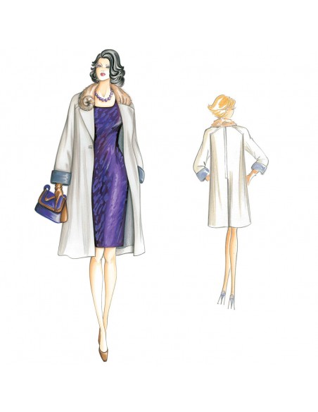 Elegante cappotto monopetto di linea svasata con morbido collo che si raccoglie a creare rosa su un lato, maniche a martello risvoltate ai polsi e spacco sul dietro. Realizzabile in cachemire o vigogna.