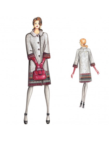 Cappotto monopetto di linea diritta con collo a camicia e maniche a martello. Tessuti consigliati: tweed con alti bordi in lana a disegno etnico o interamente in panno con polsi staccabili in piume di struzzo.
