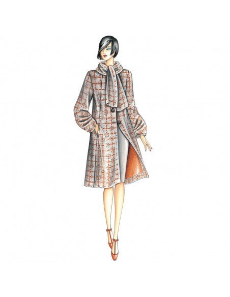 Cappotto di linea a trapezio con tagli diagonale e tasca interna, originali maniche mosse da tre pieghe verso il polso lasciate morbide, paricollo con sciarpa separata. Realizzabile in lana scozzese, tweed o vigogna.