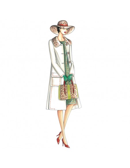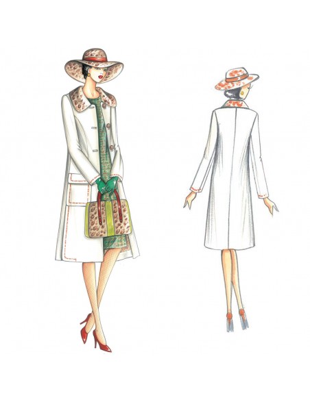 Cappotto di linea semidiritta da realizzare in tweed o lana pettinata, tasche applicate sulle quali si ferma lo spacco stondato del fianco, collo a camicia da fare eventualmente a contrasto.