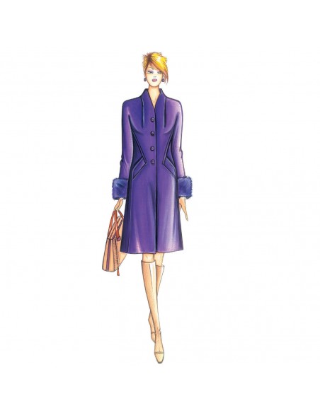 Cappotto monopetto di linea accostata sagomato da tagli geometrici, maniche a kimono, collo rialzato con pinces lasciate morbide, pattine oblique inserite e tasche interne. Realizzabile in panno, velour, vigogna.