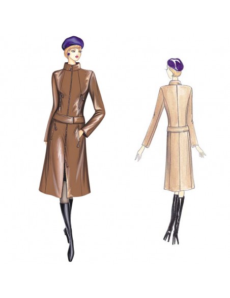 Linee pulite per il cappottino bord-a-bord chiuso da zip dalla linea accostata leggermente svasata al fondo con tagli a redingote sui quali si inseriscono le tasche a filetto chiuse da zip, collo ad anello e cintura a bassa vita fermata da velcro o gancetti. Realizzabile in panno, vernice o pelle.