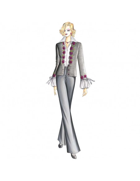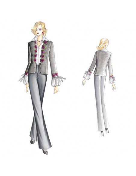 Cardigan in jersey pesante di linea semi-modellata con scollatura smerlata sottolineata da ricami in lana ed allacciatura bassa, maniche a 3/4 che lasciano intravedere lo sbuffo della blusa n. 1455.