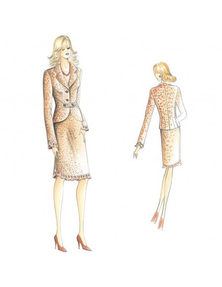 Giacca monopetto di linea modellata con originali tagli che creano un motivo a cintura inserita, collo sportivo, fondo stondato come i polsi guarniti da ruches. Realizzabile in tweed, velluto liscio o fresco di lana. Cartamodello completo di gonna diritta stondata su un lato con ruches al fondo, realizzabili anche in pizzo.