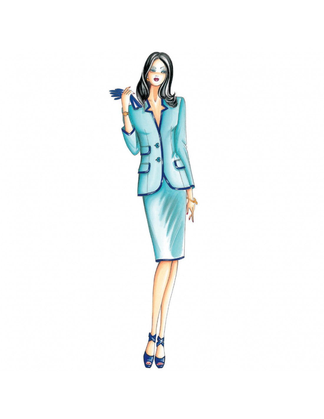 Tailleur di linea semimodellata, collo a V con spacchetti rifinito con bordino di colore contrastante; completo di gonna diritta con spacco stondato sul dietro.