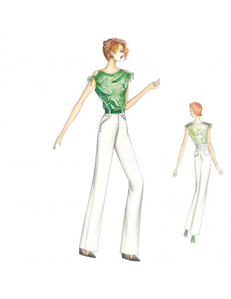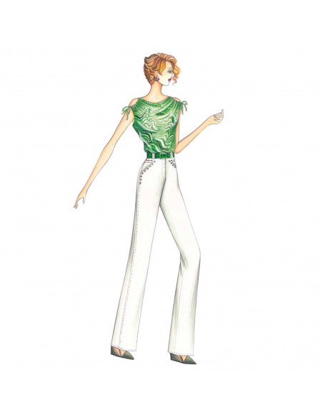 Pantaloni tipo jeans da realizzare in denim bianco, tasche con borchie applicate; lo completa il top in jersey con spalle arricciate a coulisse che formano apertura cut-out.