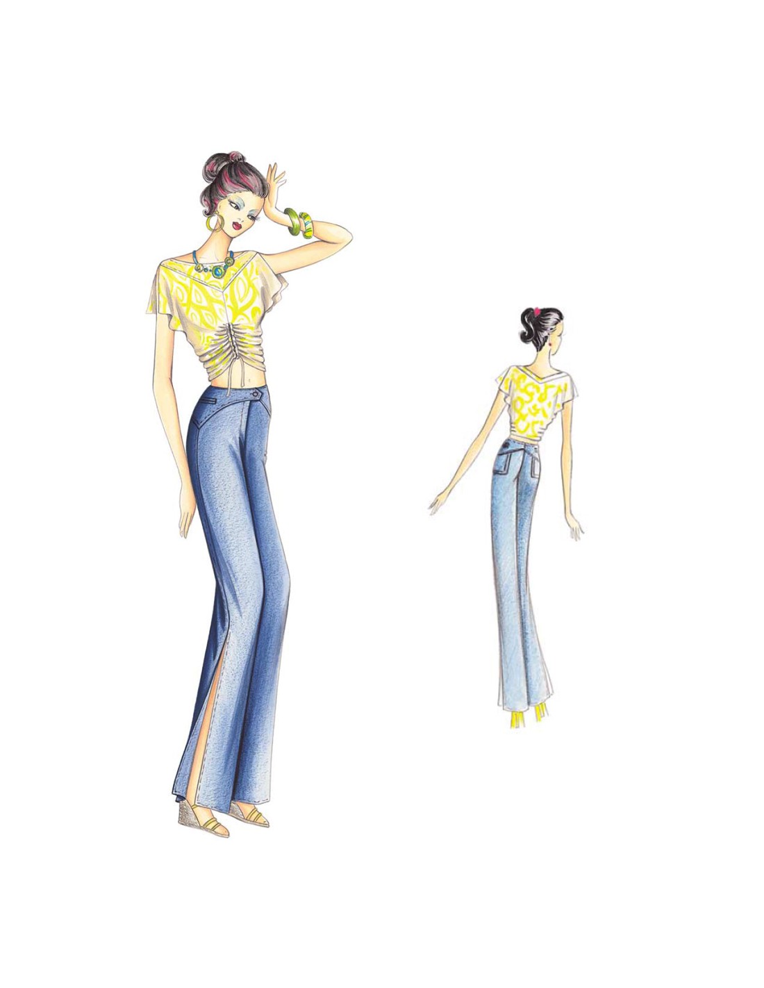 Pantaloni jeans di linea leggermente svasata al fondo con spacchi laterali, punto vita con fascioncino sagomato e tasche a filetto poste sul fianco. Completato da top con coulisse che forma arricciatura e maniche kimono aperte.