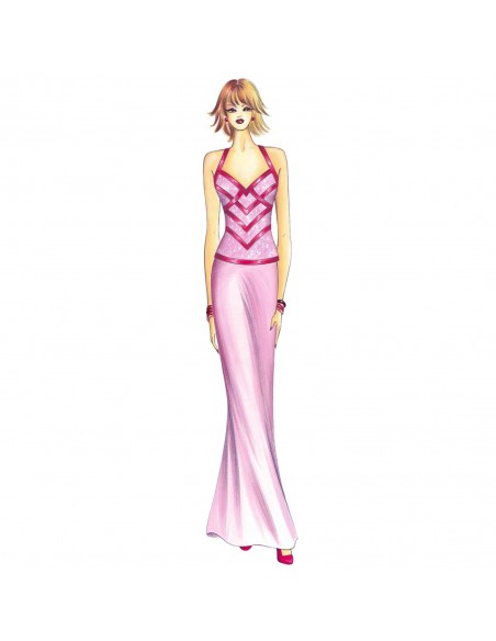Completo con bustier attraversato da tagli a V enfatizzati da bordi in colore contrastante e gonna lunga in sbieco che segue sinuosamente la silhouette. Consigliabile in tessuto paillettato per il busier e satin per la gonna.