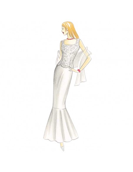 Top stondato e gonna diritta in taffetas realizzabile con o senza ampio volant sbieco al fondo. Giacchina coprispalle n. 9745.