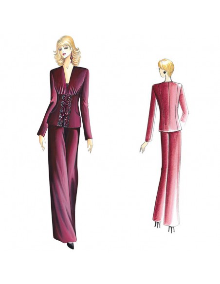 Elegante giacca consigliabile in velluto di seta rosso bordeaux, scollo a V con drappeggio, allacciatura bord-a-bord guarnita da pizzo nero con perline e tasche interne.
