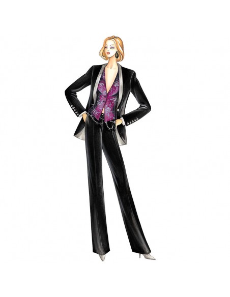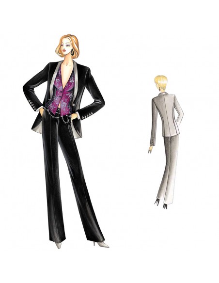 Giacca a smoking con piccolo collo sciallato in velluto e bottone posto sopra al punto vita. Gilet n. 9720. Pantaloni n. 8700.
