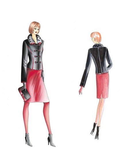 Reminiscenze anni ’60 per la giacca di linea modellata a monopetto chiusa da alamari con originale collo doppiato mosso da piegoline, maniche con pinces al gomito.