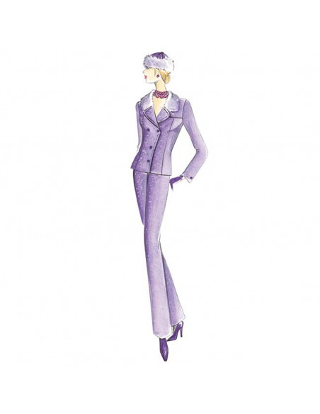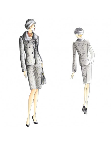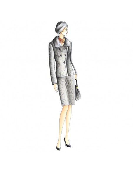 Giacca di linea modellata con allacciatura a doppio incrocio che diventa monopetto, alto carrè, collo guarnito in pelliccia. Si può indossare con i revers abbottonati od aperti.