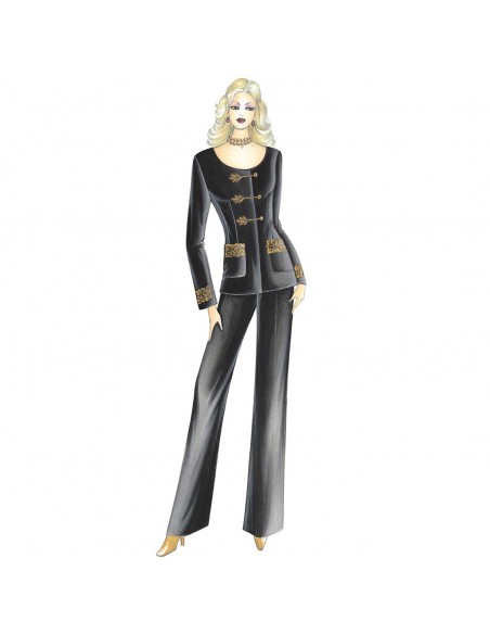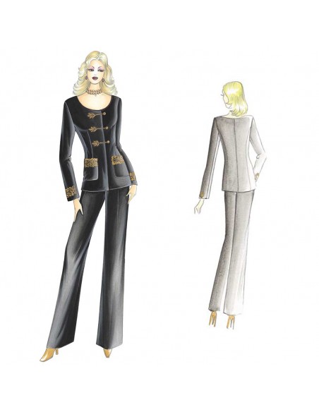 Giacca a monopetto di linea modellata chiusa da alamari con ampio scollo rotondo e bordi in pizzo dorato o bronzo sulle tasche a toppa e ai polsi. Realizzabile in velluto, crêpe, ottoman. Pantalone n. 3110.
