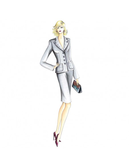Giacca monopetto di linea modellata, consigliabile in tweed o microscozzese, con tasche a toppa ed originale collo sciallato con rever fermato da bottone, realizzabili in scozzese a taglio vivo. Gonna a tubo con spacco sul dietro n. 023. Cappotto n. 1009.
