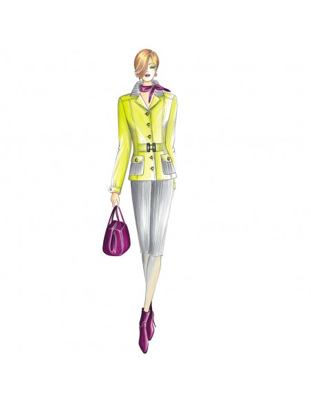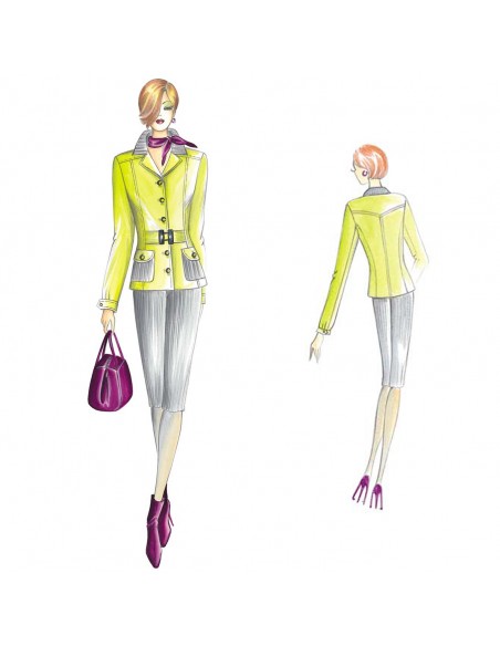 Giacca sportiva monopetto con breve cintura inserita, consigliabile in vigogna, velours, denim o nappa, sprone nel dorso, collo e tasche in lana a coste.