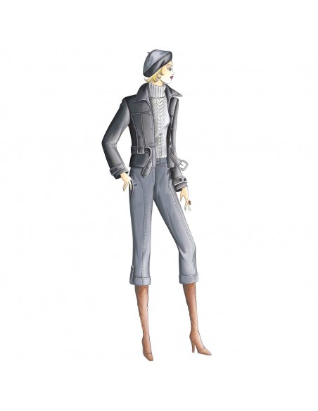 Giubbotto sportivo di linea modellata a monopetto con cintura in vita fermata da larghi passanti, tasche interne inserite sul taglio della fianchina, collo a punte allungate, listelli ai polsi, carrè e sprone sagomati. Consigliabile in fustagno o vigogna. Pantaloni n. 1446.