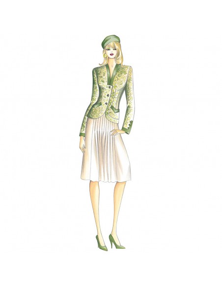Giacchina di breve lunghezza di linea attillata da realizzare in jersey fantasia o scozzese, collo e tasche con bordo in passamaneria di lana o velluto. Gonna n. 1407.