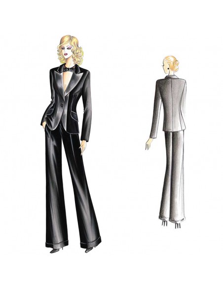Giacca a smoking in crêpe di lana fermata da un solo bottone, rever a lancia e bordo in raso. Pantaloni svasati n. 0350.