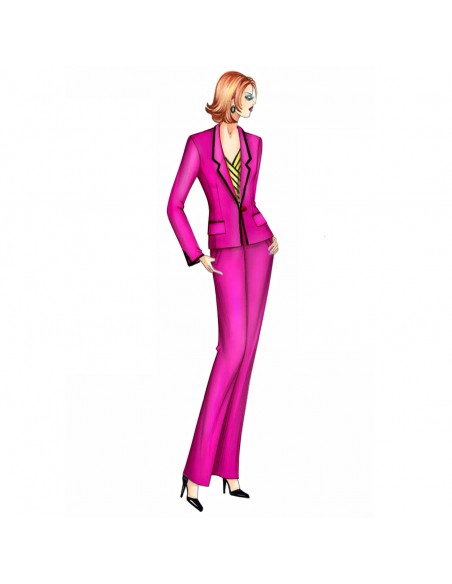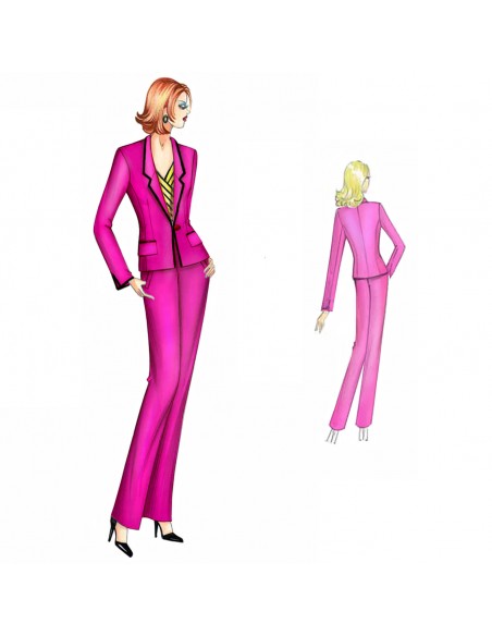 Giacca monopetto di linea accostata con occhielli fermati da laccetti sia nell’ allacciatura che ai polsi, collo sportivo a revers abbassati e tasche interne con pattina. Pantaloni n. 1629.
