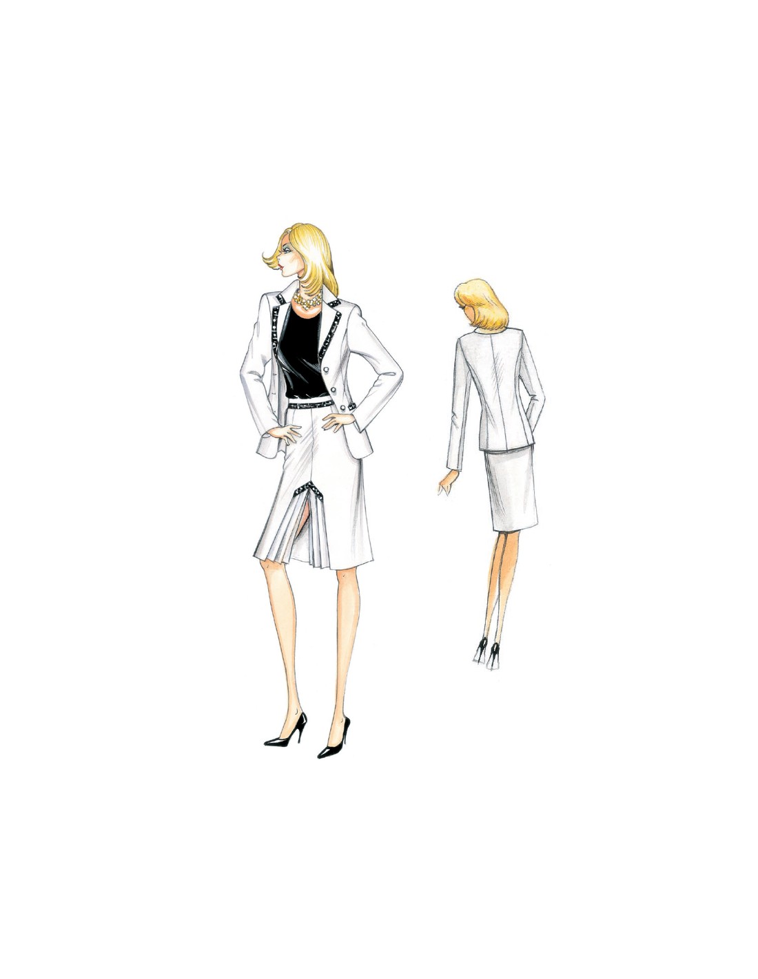 Giacca in crêpe-satin di linea semimodellata a monopetto, collo, revers e tasche guarniti da bordo con cristalli e paillettes oppure bordature in raso. Da abbinare a chemisier n. 1862 oppure gonna n. 1865.