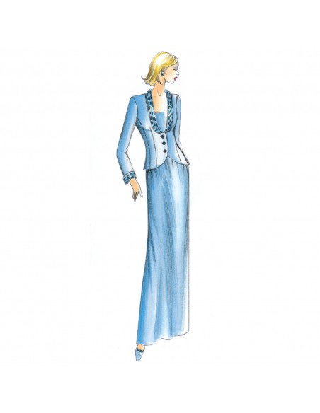 Giacca da realizzare in crêpe o raso di linea modellata con collo sciallato fermato da tre bottoni.