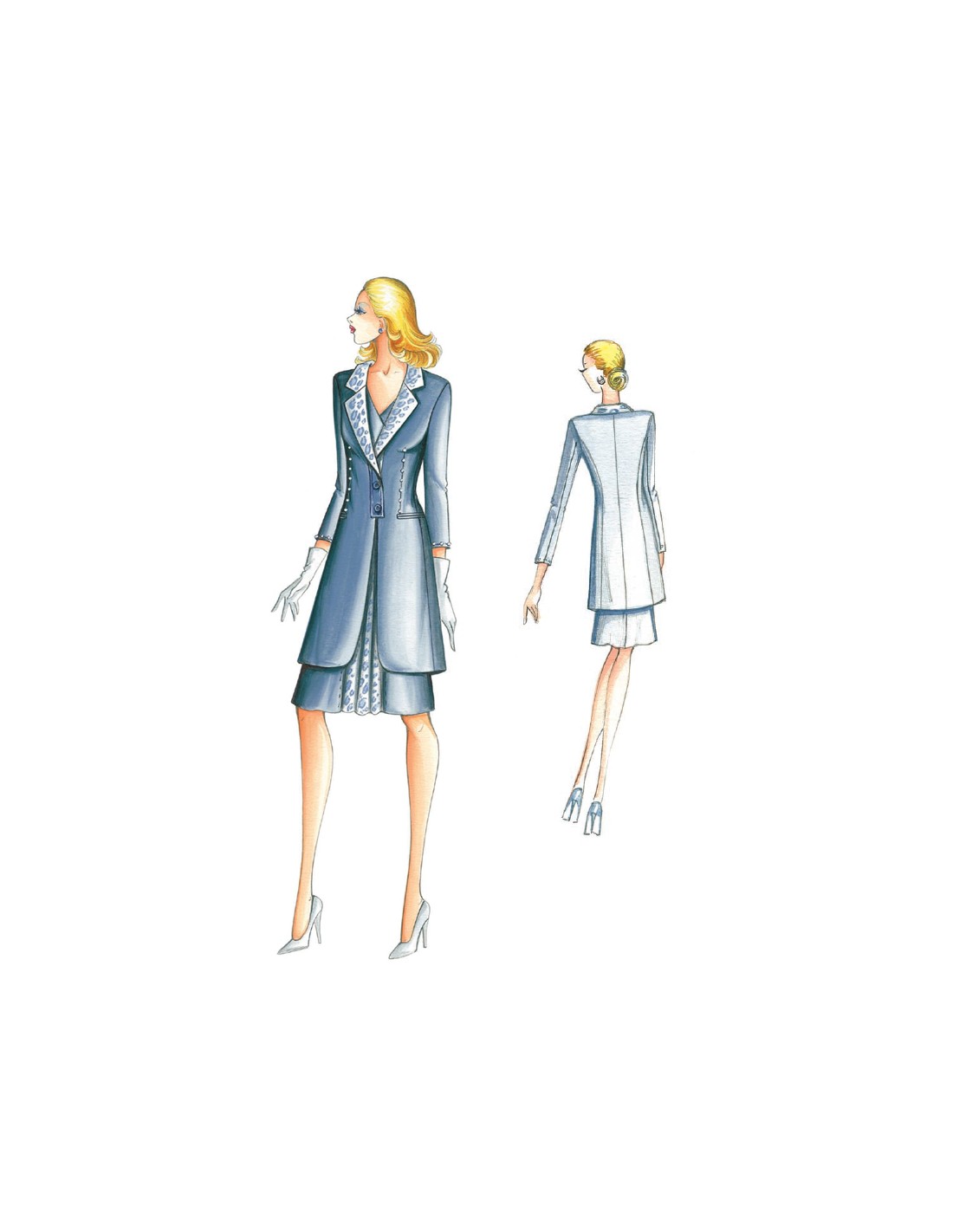 Giacca di linea a redingote, collo sportivo intero alla paramontura, tasche a filetto e riprese con borchie o perline. Abbinabile ad abito n. 2141.