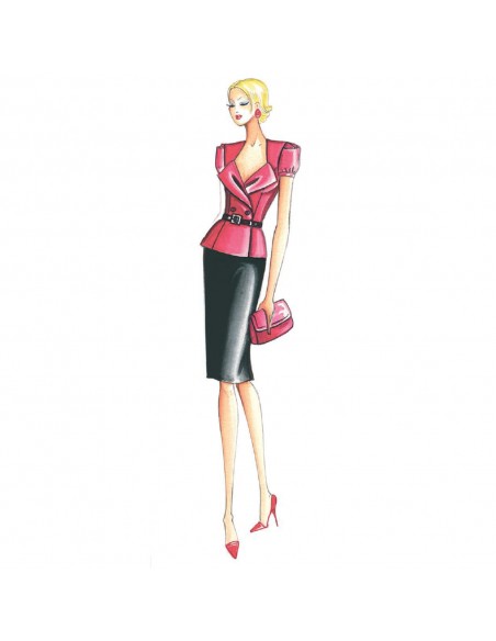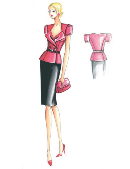 Giacchina a doppio incrocio con ampi revers sulla scollatura a cuore, maniche corte a calice.