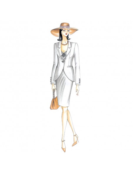 Giacca monopetto di linea modellata chiusa da singolo bottone con collo sportivo scostato, fondo stondato e tasche a filetto alte. Realizzabile in gabardine, fresco di lana, crêpe, raso duchesse.