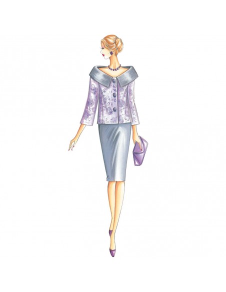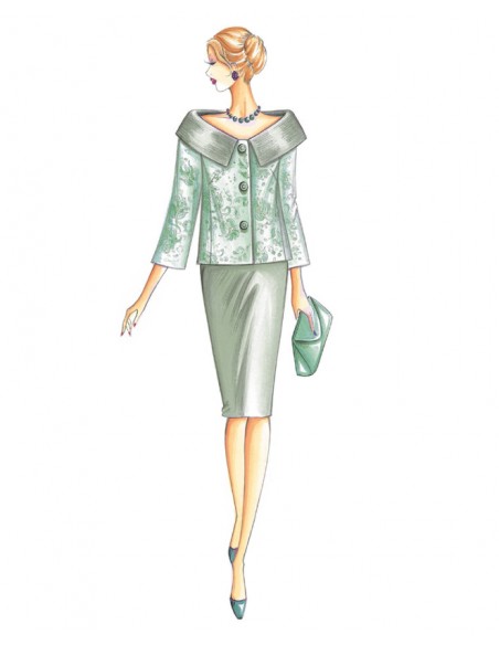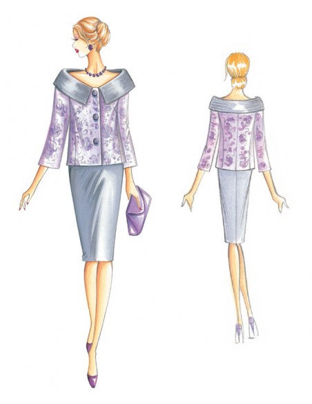 Giacca a trapezio con ampio collo a stola e allacciatura a tre bottoni, maniche leggermente svasate, realizzabile in tessuto fantasia o raso con pizzo applicato.
