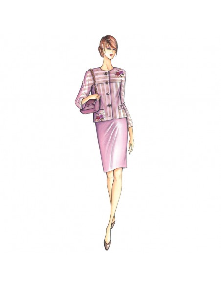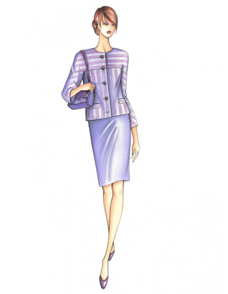 Giacca corta a monopetto di linea semi-diritta con maniche a martello che creano carré, girocollo semplice e taschine interne. Di particolare effetto se in tessuto a righe od ottoman, puó essere realizzata anche in crêpe, lana cotta o bouclé.
