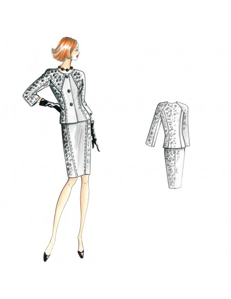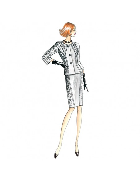 Giacchina monopetto di linea modellata, maniche a kimono ¾ che si uniscono al carrè sagomato a punte sul davanti. Tessuti consigliati: doppio jersey o fresco di lana.