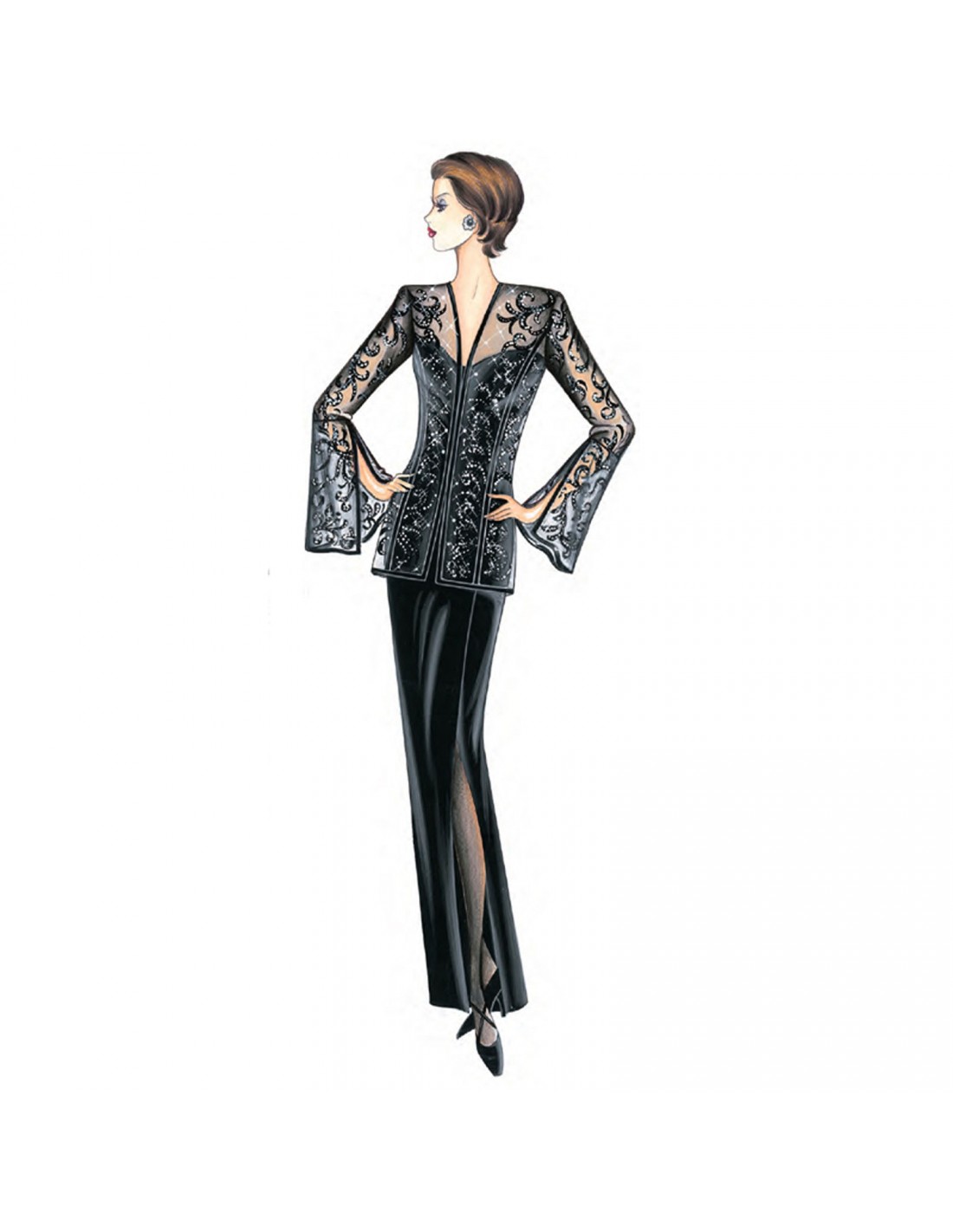 Giacca da realizzare in pizzo o velluto con allacciatura fermata da ganci interni e maniche svasate.