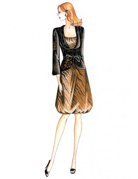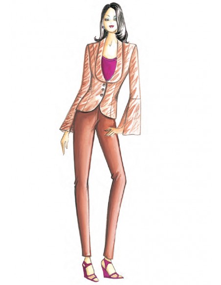 Reminiscenze couture anni ’60 per la giacca di linea attillata con nastro annodato in vita, maniche ¾ e collo sciallato. Realizzabile in damascato, crêpe o shantung.
