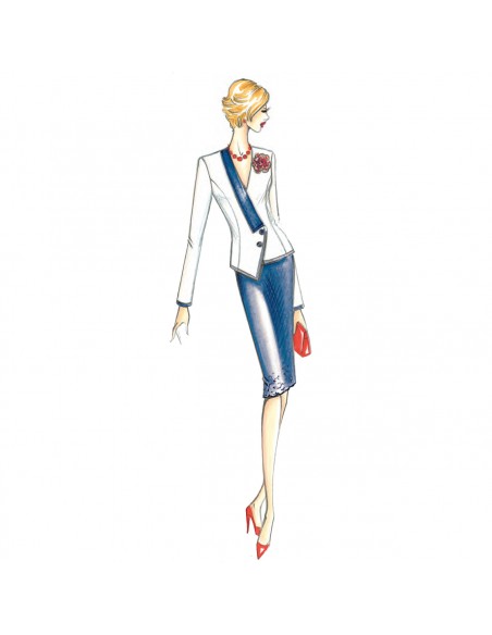 Giacca con singolo rever e orlo asimmetrico, allacciatura laterale fermata da due bottoni in tinta come la bordatura.