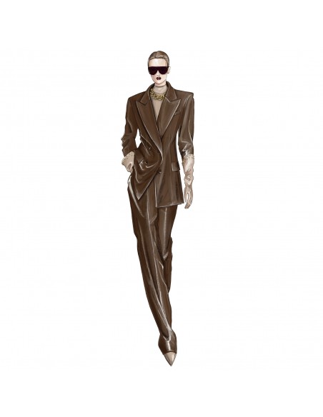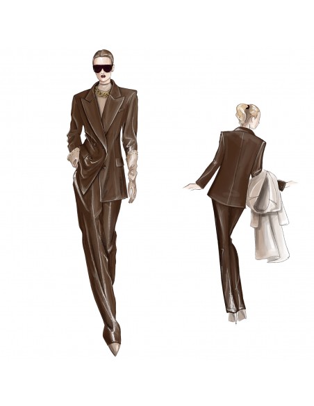 Atmosfere Anni ’80 per la giacca doppiopetto di linea semi-modellata con spalle ampie enfatizzate e collo dai revers a lancia. Tessuti consigliati: fresco di lana, gessato, tweed, grisaglia.