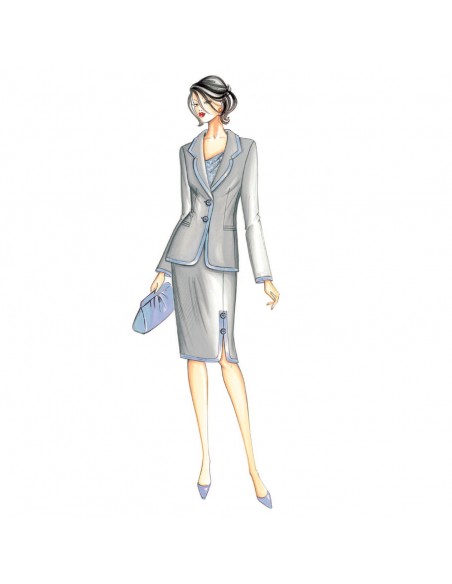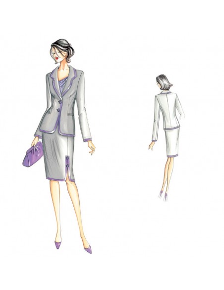 Giacca di linea classica dal collo intero sciallato con punte rialzate e bordature in raso o passamaneria. Gonna diritta con spacco laterale stondato inclusa. Top n. 2723.