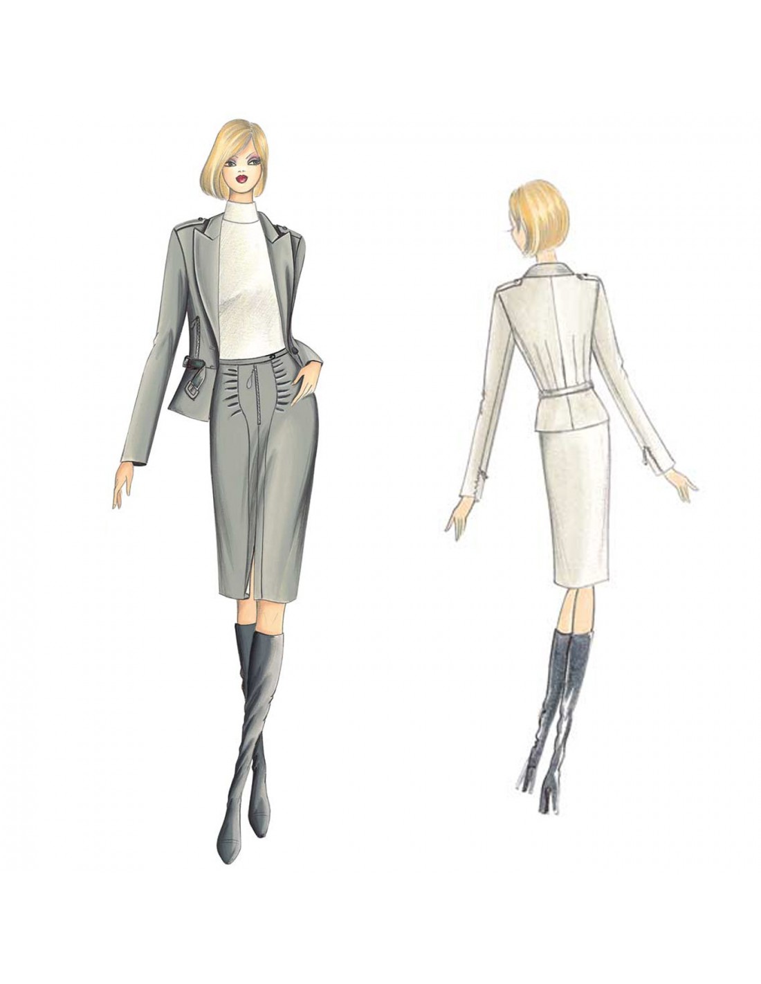 Giacca monopetto di linea modellata con baschina, cinturina in vita, collo a lancia, listelli sulle spalle e tasche interne chiuse da zip come i polsi. Tessuti consigliati: fresco di lana stretch, gessato, gabardine. Gonna n. 8892.