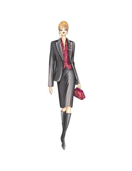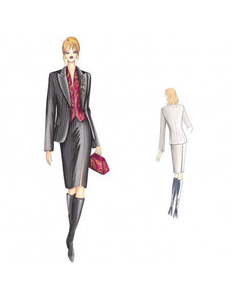 Mix fra maschile e femminile per la giacca monopetto realizzabile in gessato con ricami sul rever a lancia e sulle pattine. Gonna n. 8440.